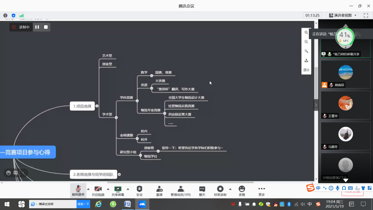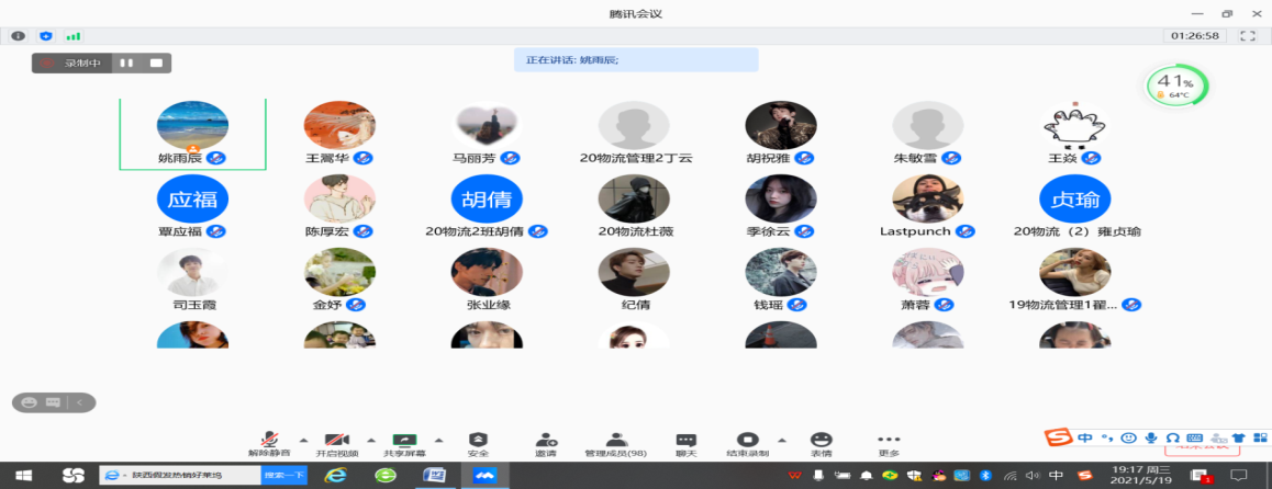 2021年5月19日晚上6:00至7:30,物流系举办了第二届就业经验分享会。物流系姚雨辰副主任主持了会议,物流系主任姜方桃、物流系副主任王翯华、辅导员马丽芳老师和物流专业的同学总共112人参加了此次会议。会议采用用腾讯视频的形式(腾讯会议号:293573855),主要由几位大四毕业班同学针对自己就业相关的经验进行交流分享。