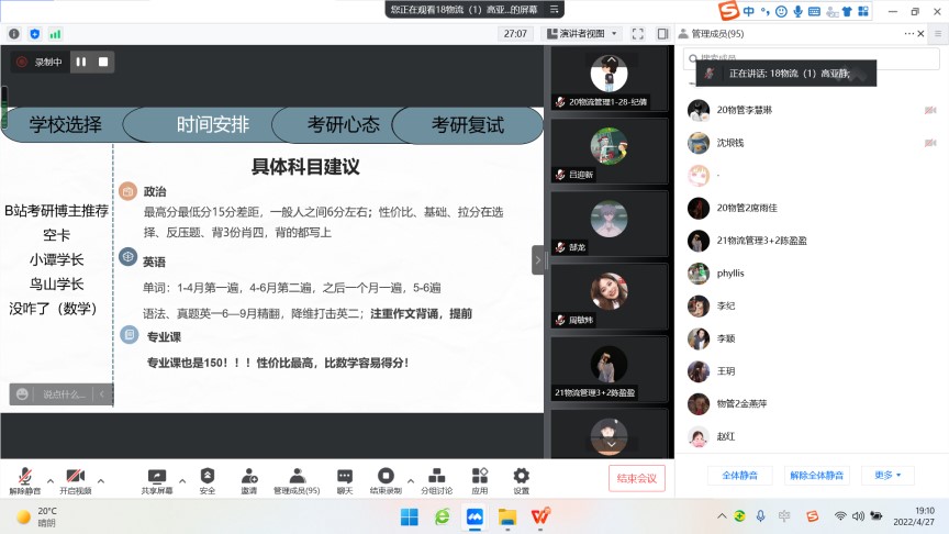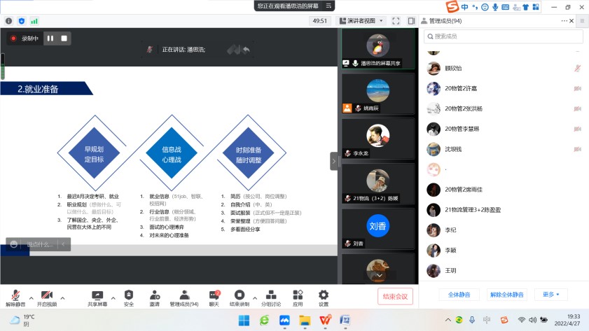 2022年4月27日晚上7:00至8:00,物流系举办了第三届就业经验分享会。物流系姚雨辰副主任主持了会议,物流系主任姜方桃、物流系老师程娟和物流系员工总共95人参加了此次会议。会议采用用腾讯视频的形式(腾讯会议号:682737978),主要由几位大四毕业班同学针对自己考研计划安排、个人简历制作、面试准备等就业相关的经验进行交流分享。