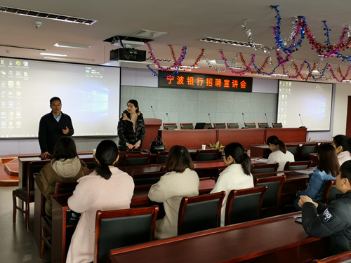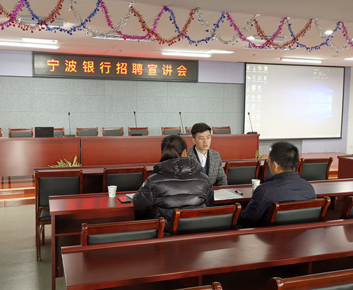 当天下午,学院在科技楼3号楼313报告厅举行宁波银行专场招聘会。宁波银行科学园支行王从庆副行长等行业专家,对有意应聘宁波银行的19届毕业班员工进行面试,BBIN宝盈官网学工办主任、就业干事彭小智和学院员工社科联副主席郭正宇同学在现场做好组织服务工作。